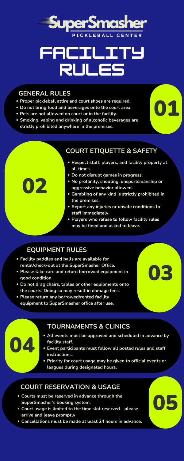 By booking, you confirm that you and all players using your booked court have read and agree to follow the facility rules. You acknowledge and accept all risks associated with play and facility use. SuperSmasher is not responsible for any injuries, accidents, or lost belongings. Participation is at your own risk. You also grant permission for SuperSmasher to use event photos or videos for promotional purposes.